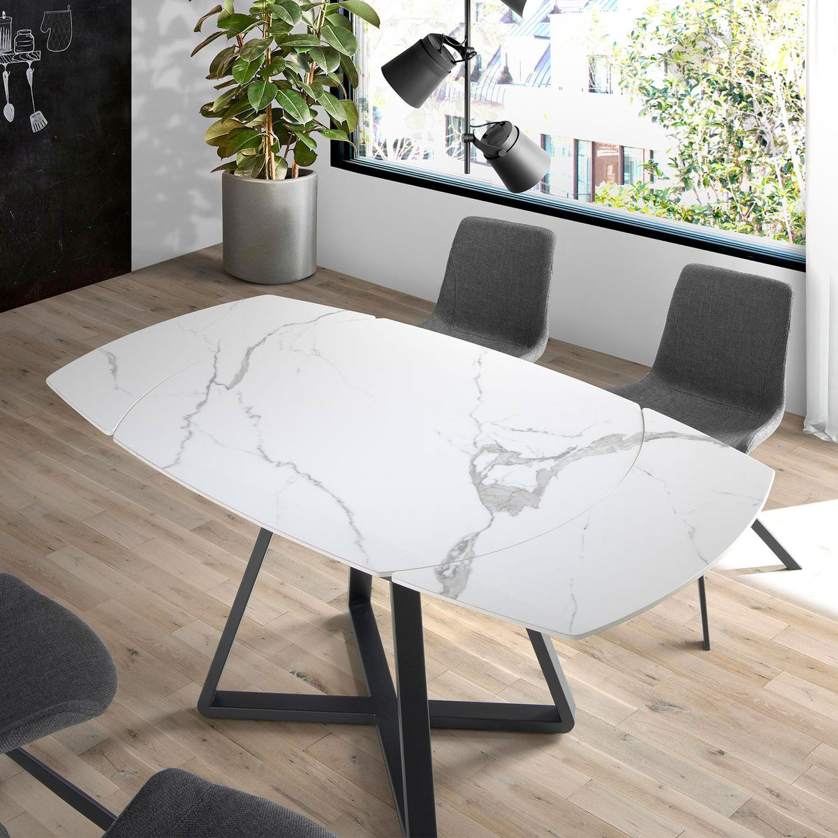 طاولة طعام بيضاوية قابلة للتمديد من الرخام البورسلان والفولاذ الأسود