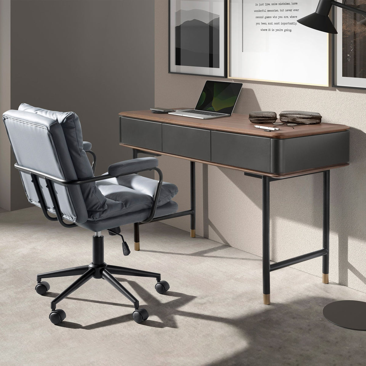 Modern rectangular console table made of dark grey MDF with a matt finish and an elegant wooden top in natural walnut veneer. Its structure of black stainless steel legs brings the touch of modernity and avant-garde that you are looking for for your home. Its original detail in polished stainless steel in golden colour adds the perfect touch of style to your living room. It has a large storage space with 3 drawers with push and pull opening and closing system.