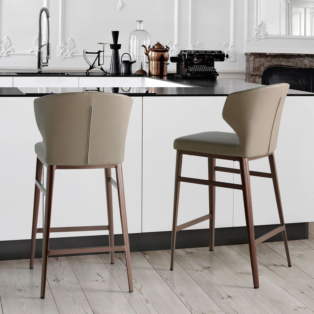 Modern design stool with seat and back upholstered in dark mink leatherette. Its bronze-coloured stainless steel legs with an avant-garde yet timeless style will make it a must-have for your kitchen or dining room. This stool by Angel Cerdá combines the unique and personal style of the brand, as well as the highest comfort and stability, thanks to the high quality of its upholstery and the original structure of its legs.