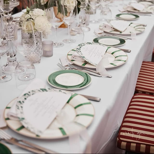 اجمع بين البساطة العصرية والرقي الكلاسيكي مع طقم Striche Verdi e Oro من دار Geminiano Cozzi Venezia 1765. يتم تصنيع هذا الطقم وتزيينه يدويًا بالكامل في فينيسيا – إيطاليا، ويتميز بنمط خطوط خضراء أنيقة تتناغم مع لمسات من الذهب عيار 24 قيراط، مستوحاة من التقاليد الإيطالية الراقية والذوق المعماري المعاصر.